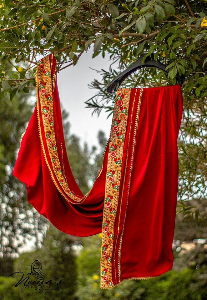 Article: Sheesh mehal. Fabric: Imported Dull Silk ( non slippery). Length: 2.75 yards. Width: 1.75 yards. Work: beautiful floral and leafs work, mixture of sequins and samosa Patti with pleats